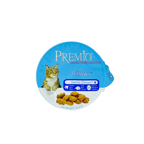 פרמיו כריות דנטליות, Premio Pillows Dental Chews. חטיף כריות רך תוסף למזון היבש, לחתולים מכל הגזעים ובכל הגילאים. חטיף פרמיו כריות לעיסה דנטליות לחתול מסייע בניקוי השיניים ומונע היווצרות אבן שן. מכיל בשר עוף אמיתי ומועשר במינרלים המסייעים לבריאות החתול. פרמיו חטיף כריות בעל מעטפת מפנקת ומילוי עשיר. טעים במיוחד. משקל אריזה: 60 גר’.