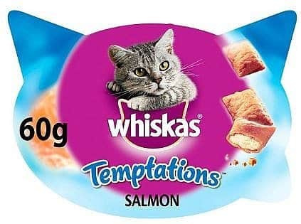 Whiskas Salmon Temptations Cat Treats 60G. חטיף לחתול ויסקאס טמפטיישן סלמון, בעל מעטפת פריכה וטעימה עם מילוי מפנק ומלא טעם. מצויין לגיוון התפריט והמזון היבש של החתול. עשיר בחומרים מזינים ויטמינים ומינרלים התורמים רבות לבריאות החתול. מזון לחתול תוצרת ויסקאס ארצות הברית.