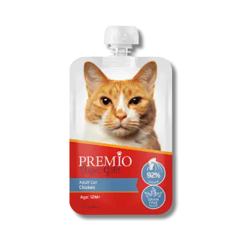 פרמיו מחית בשר לחתול בוגר במרקם קרם נוזלי עם עוף 92%, ללא דגנים בטעימות גבוהה.